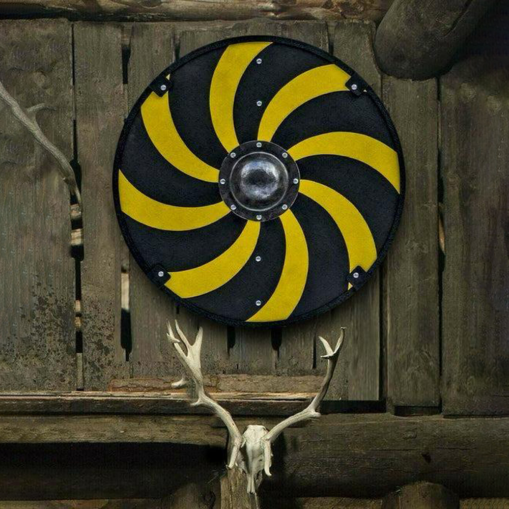 Command attention on the battlefield with this handcrafted Black & Yellow Spiral Viking Shield, featuring a striking black and yellow spiral motif. Designed to evoke motion and energy, this bold pattern symbolizes chaos, force, and the turning of fate—a powerful emblem for any warrior of legend.